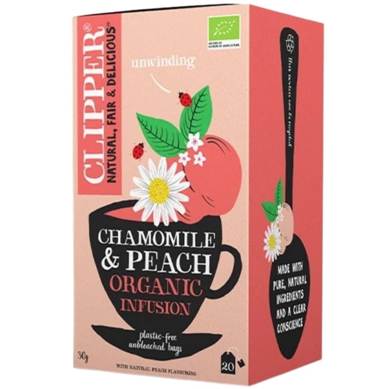Ekologiczna herbatka rumiankowa marki Clipper to owocowo-ziołowa kompozycja o smaku brzoskwiniowym, wzbogacona dziką różą, skórką pomarańczy oraz naturalnymi aromatami mango i pomarańczy. Produkt posiada certyfikat BIO, jest w pełni wegański, bezglutenowy i nie zawiera dodatku cukru, stanowiąc subtelny napar o bogatym, naturalnym profilu aromatycznym.
