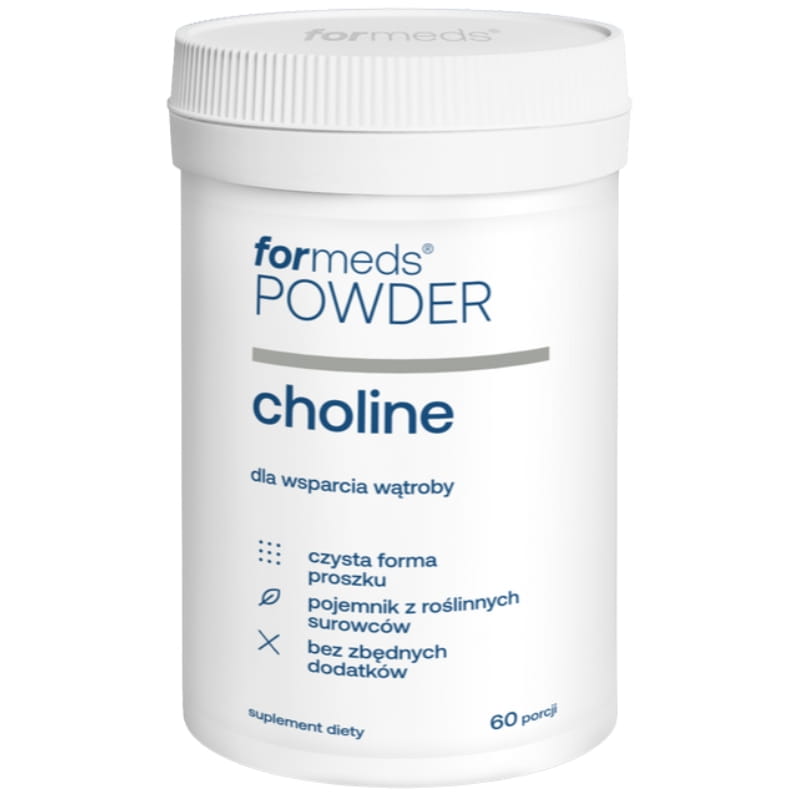 POWDER CHOLINE marki ForMeds to wysokiej jakości suplement diety zawierający cholinę (w formie wodorowinianu choliny) w czystej postaci proszku. Opakowanie o masie netto 42 g wystarcza na 60 porcji produktu, co zapewnia pełne, dwumiesięczne wsparcie dietetyczne. Cholina jest istotnym składnikiem odżywczym, wchodzącym w skład fosfolipidów. Produkt marki ForMeds został stworzony zgodnie z filozofią „clean label” – nie zawiera sztucznych wypełniaczy, barwników, słodzików ani konserwantów. Dzięki dołączonej do opakowania miarce możliwe jest precyzyjne odmierzenie dziennej porcji. Forma proszku jest idealną alternatywą dla osób mających trudności z połykaniem kapsułek i ceniących produkty o maksymalnie uproszczonym, transparentnym składzie.
