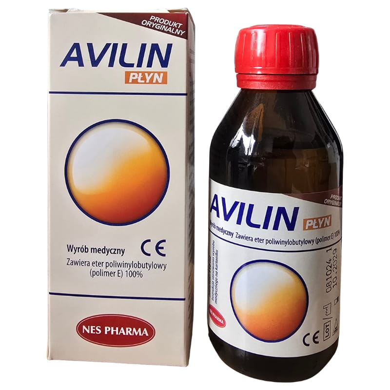 Avilin Balsam (płyn) marki Nes-Pharma to specjalistyczny preparat o gęstej, lepkiej konsystencji, opracowany przez polskiego producenta Nes-Pharma. Opakowanie zawiera 110ml płynu, którego głównym składnikiem jest polimer Etofen (eter poliwinylobutylowy). Dzięki swojej unikalnej strukturze, produkt tworzy na powierzchni barierę ochronną, która jest stabilna chemicznie i nie wchodzi w reakcje ze składnikami ustrojowymi. Marka Nes-Pharma stworzyła formułę, która dzięki wysokiej adhezji długo utrzymuje się w miejscu aplikacji. Produkt jest bezbarwny, ma charakterystyczny zapach i jest dostarczany w szklanej butelce, co ułatwia jego właściwe przechowywanie.