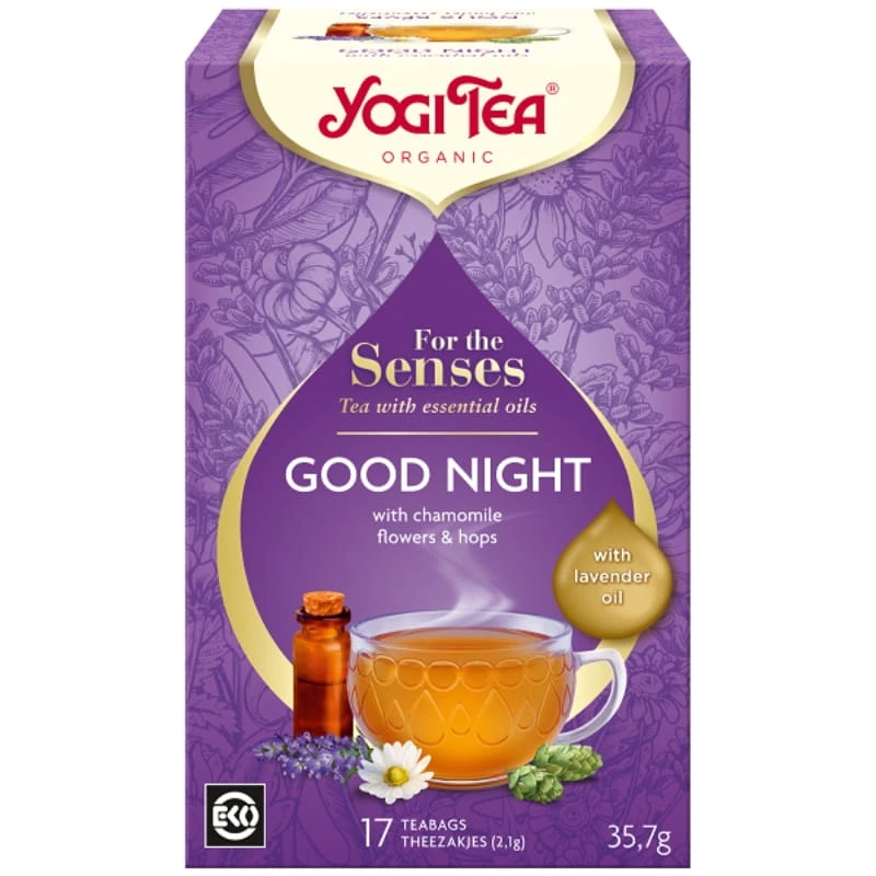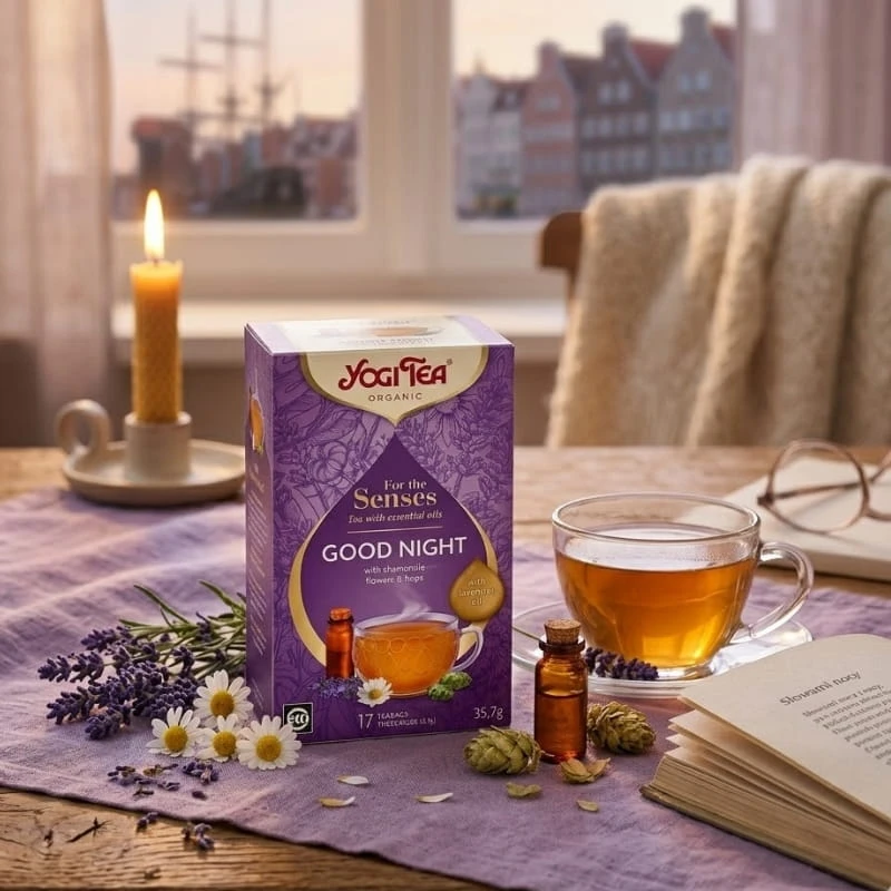 Yogi Tea For the Senses Good Night to wyjątkowa, ekologiczna kompozycja stworzona z myślą o wieczornym wyciszeniu i spokojnym śnie. Wyrafinowane połączenie wysokiej jakości olejku lawendowego z delikatnym rumiankiem i szyszkami chmielu tworzy napar, który pomaga odprężyć ciało oraz umysł po intensywnym dniu. Ta aromatyczna mieszanka o subtelnym, kwiatowym profilu smakowym stanowi idealny rytuał przed spoczynkiem, wprowadzając harmonię i przygotowując zmysły do regenerującego odpoczynku.